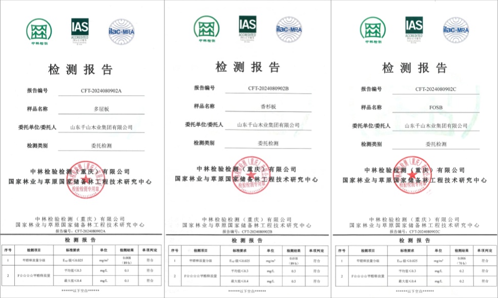 此次,千山板材實(shí)木多層板、實(shí)木香杉木板、實(shí)木刨片板均通過甲醛釋放量分級(jí)和F☆☆☆☆甲醛釋放量檢測,檢測數(shù)值均優(yōu)于標(biāo)準(zhǔn)要求
