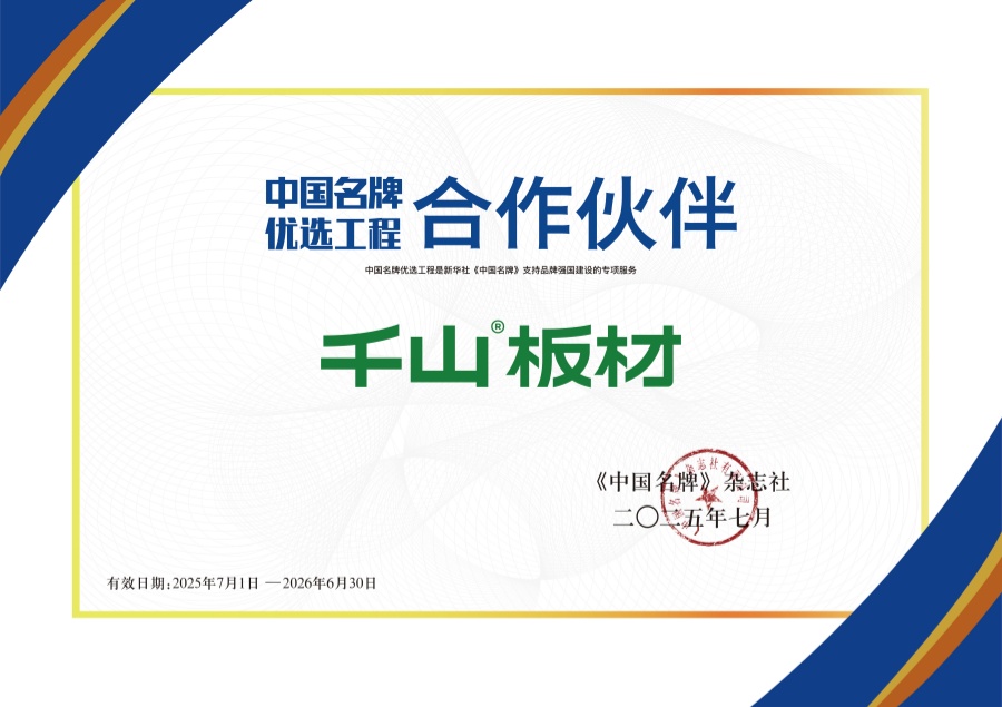 權威媒體平臺背書,品牌賦能!2025年7月,千山板材與新華社《中國名牌》達成戰略合作,成功成為中國名牌優選工程合作伙伴。