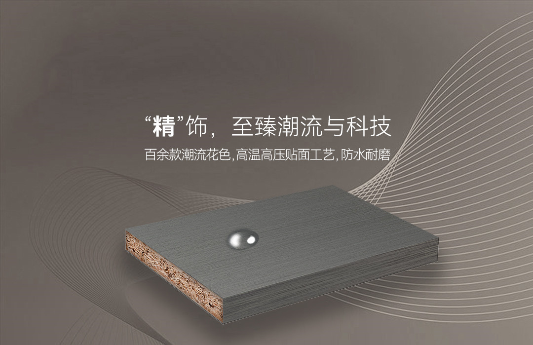 飾面采用高壓底紙、進口油墨印刷,成色效果更清晰。百余種潮流花色,滿足不同風格需求。2000噸超強壓機高溫壓貼,30秒超長貼合,表面防水防潮、磨抗劃。